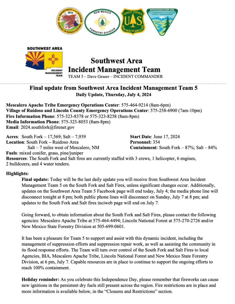 Final update: Today will be the last daily update you will receive from Southwest Area Incident Management Team 5 on the South Fork and Salt Fires, unless significant changes occur. Additionally, updates on the Southwest Area Team 5 Facebook page will end today, July 4; the media phone line will disconnect tonight at 8 pm; both public phone lines will disconnect on Sunday, July 7 at 8 pm; and updates to the South Fork and Salt fires inciweb page will end on July 7.