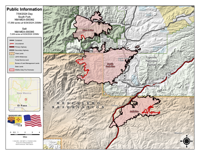 Going forward, to obtain information about the South Fork and Salt Fires, please contact the following agencies: Mescalero Apache Tribe at 575-464-4494; Lincoln National Forest at 575-270-2726 and/or New Mexico State Forestry Division at 505-699-0601.