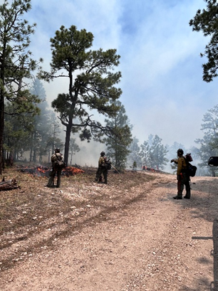 UPDATE: The Fisher fire is currently 8,130 acres. Yesterday crews were able to begin containment lines along the West side (Point of Rocks Canyon) of the fire. On the East side, heavy equipment work was performed following the 549 Road. This work is to allow fire personnel and vehicles the ability to patrol and secure the fire’s edge. The Incident Commander and Agency Administrator were able to view the fire area aerially and confirm that fire behavior remained low/moderate and safety objectives remained the same. Today work will mirror yesterday’s efforts with the goal of further containment. With likely weather activity, firefighter safety is the priority. The team is close to achieving the intended outcome of positively reintroducing fire to the ecosystem.