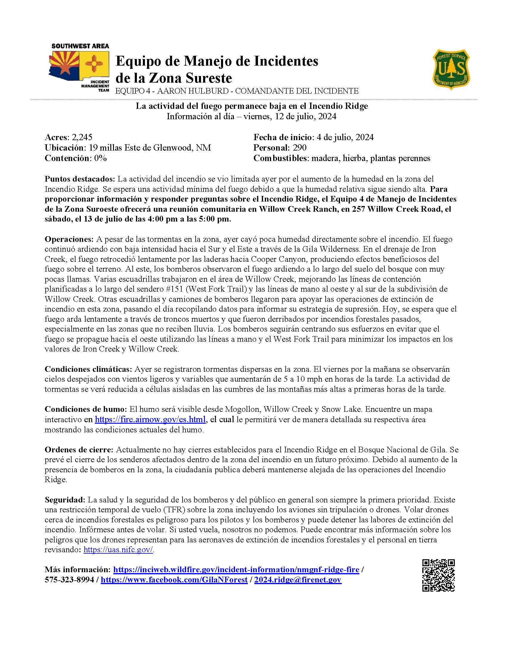 Highlights: Fire activity was limited yesterday by increased moisture around the Ridge Fire area. Minimal fire activity is expected again today as relative humidity remains high. To provide information and answer questions about the Ridge Fire, the Southwest Incident Management Team 4 will host a community open house at the Willow Creek Ranch, located at 257 Willow Creek Road, on Saturday, July 13, from 4:00 PM to 5:00 PM.