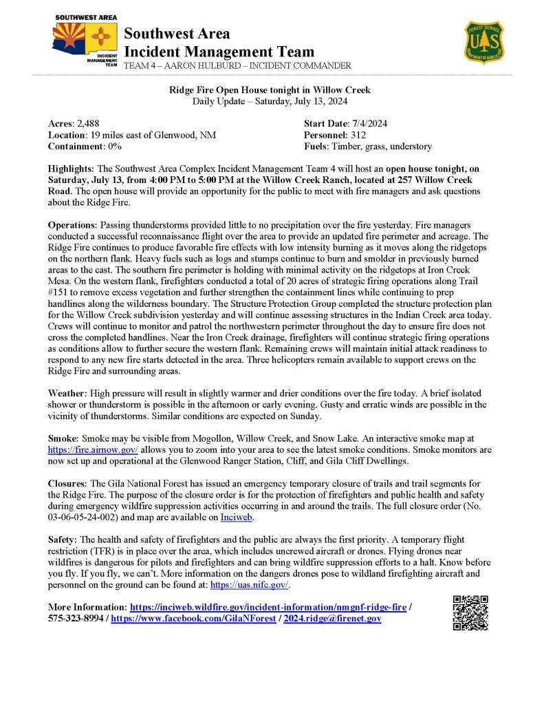 Highlights: The Southwest Area Complex Incident Management Team 4 will host an open house tonight, on Saturday, July 13, from 4:00 PM to 5:00 PM at the Willow Creek Ranch, located at 257 Willow Creek Road. The open house will provide an opportunity for the public to meet with fire managers and ask questions about the Ridge Fire.