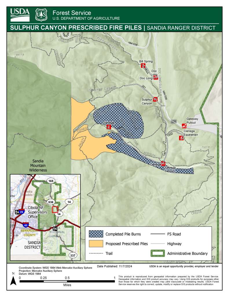 ALBUQUERQUE, NM – November 12, 2024 – Cibola National Forest and National Grasslands fire crews are preparing to implement prescribed (Rx) fire Thursday November 14th on 34 acres of piles within the previously announced Sulphur unit of the Sandia Rx Fire Plan.