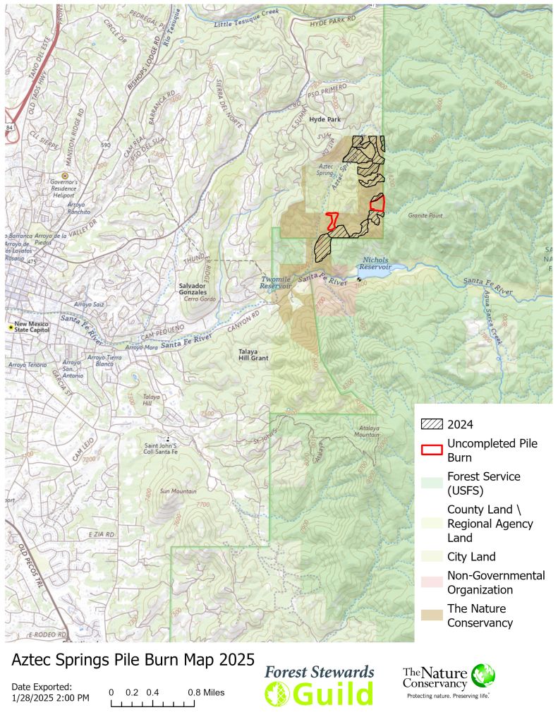 Santa Fe, NM – The Forest Stewards Guild and The Nature Conservancy will utilize snowy conditions to conduct a prescribed pile burn on Nature Conservancy land this winter to complete the last 10 acres of the 120 acres located just east of Santa Fe, NM beginning as soon as January 30th. The area will be treated with hand ignitions by trained and qualified firefighters working under a burn boss within the parameters of an approved and permitted burn plan. The amount and area burned will be contingent on wind, snow depth, temperature, and expected weather patterns and may be postponed and/or cancelled until conditions are favorable. All burn operations will occur with snow on the ground and will be patrolled until out.