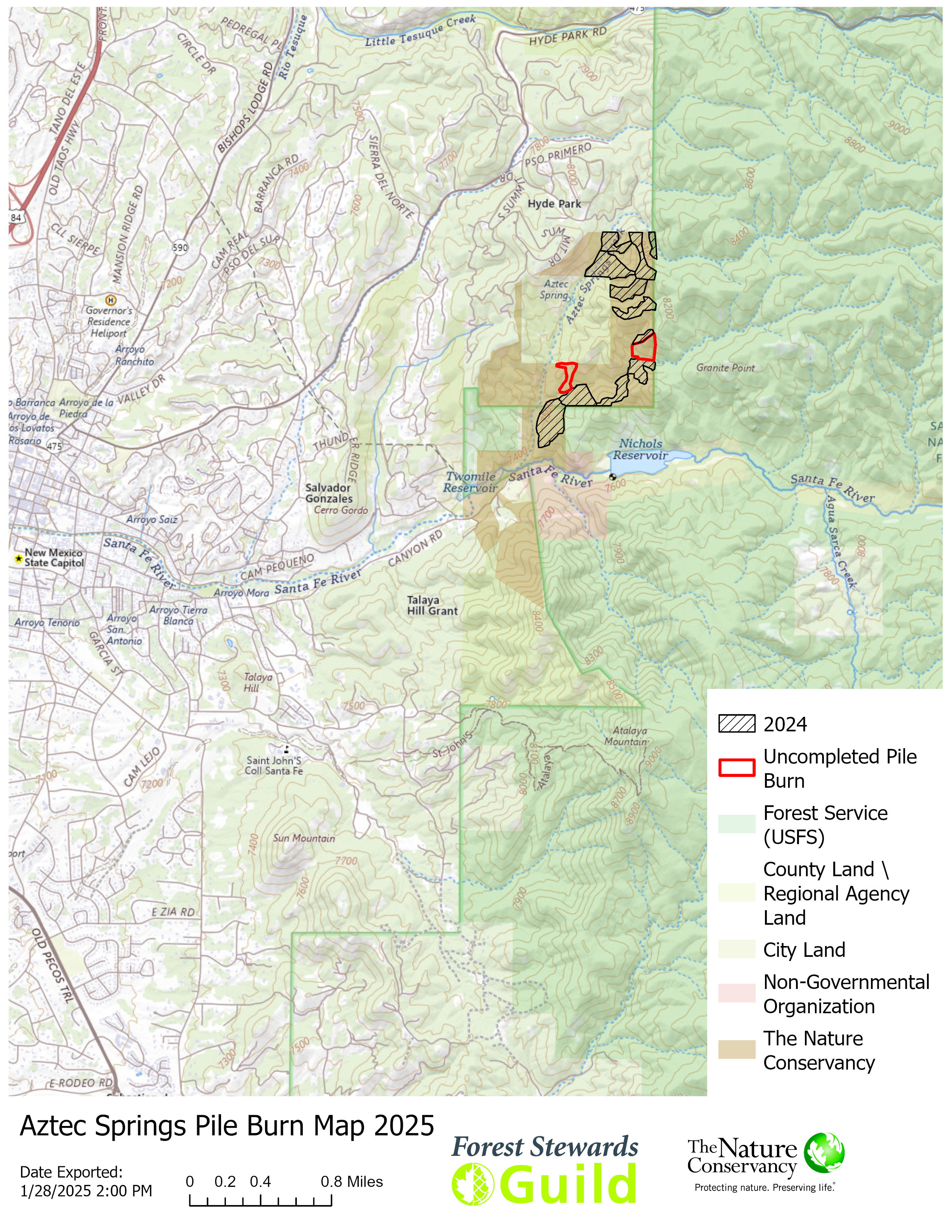 Santa Fe, NM – The Forest Stewards Guild and The Nature Conservancy will utilize snowy conditions to conduct a prescribed pile burn on Nature Conservancy land this winter to complete the last 10 acres of the 120 acres located just east of Santa Fe, NM beginning as soon as January 30th. The area will be treated with hand ignitions by trained and qualified firefighters working under a burn boss within the parameters of an approved and permitted burn plan. The amount and area burned will be contingent on wind, snow depth, temperature, and expected weather patterns and may be postponed and/or cancelled until conditions are favorable. All burn operations will occur with snow on the ground and will be patrolled until out.