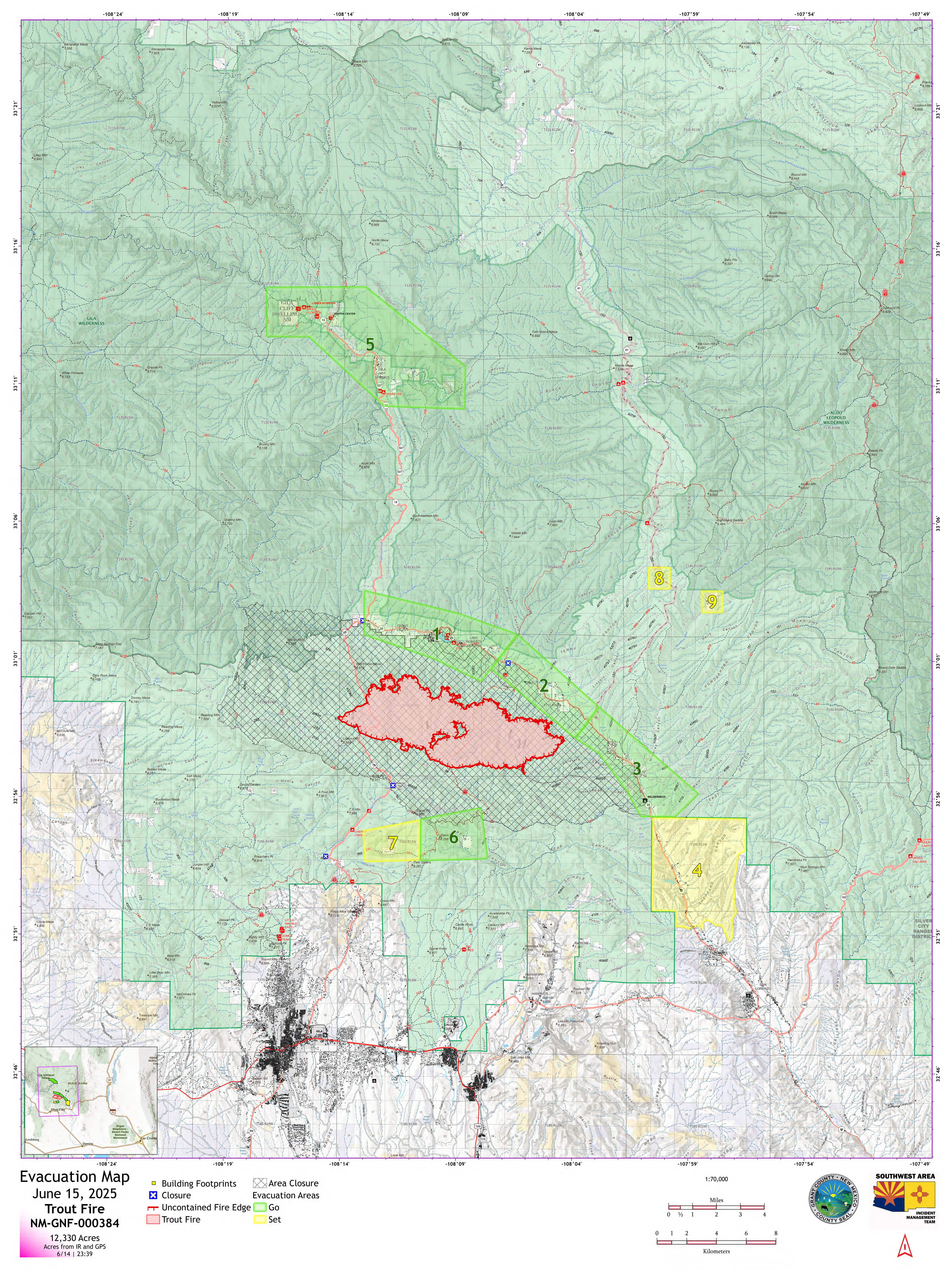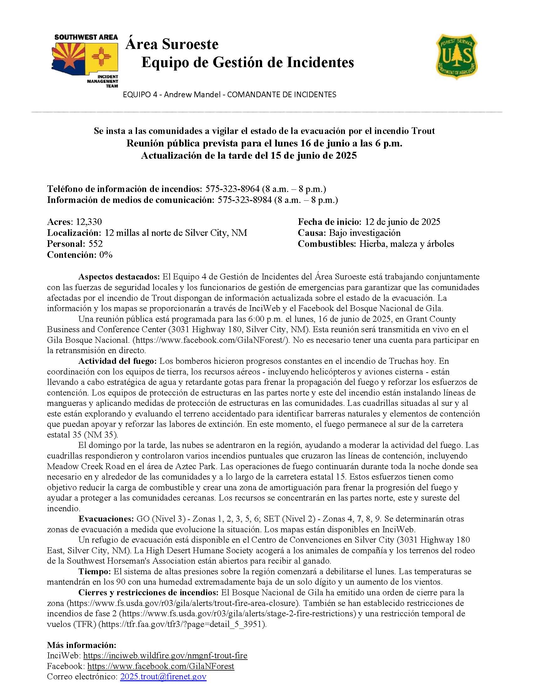 Highlights: Southwest Area Incident Management Team 4 is working in tandem with local law enforcement and emergency management officials to ensure updated evacuation status information is readily available for communities impacted by the Trout Fire. Information and maps will be provided via InciWeb and the Gila National Forest Facebook.