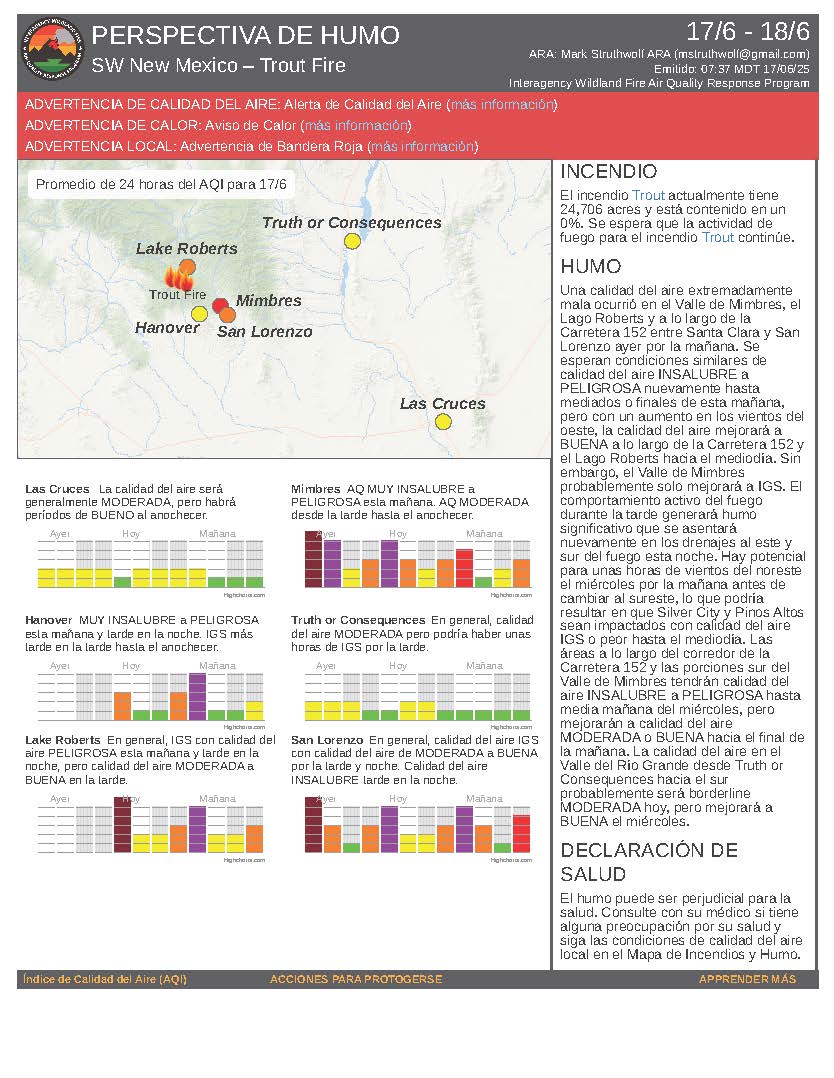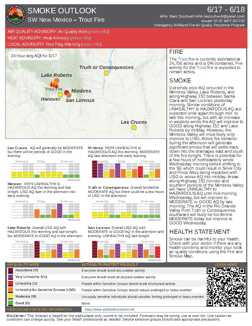 Closures & Fire Restrictions: The Gila National Forest has issued a closure order for the fire area (https://www.fs.usda.gov/r03/gila/alerts/trout-fire-area-closure). Stage 2 Fire Restrictions are in place (https://www.fs.usda.gov/r03/gila/alerts/stage-2-fire-restrictions) and a Temporary Flight Restriction (TFR) is in effect (https://tfr.faa.gov/tfr3/?page=detail_5_3951).
