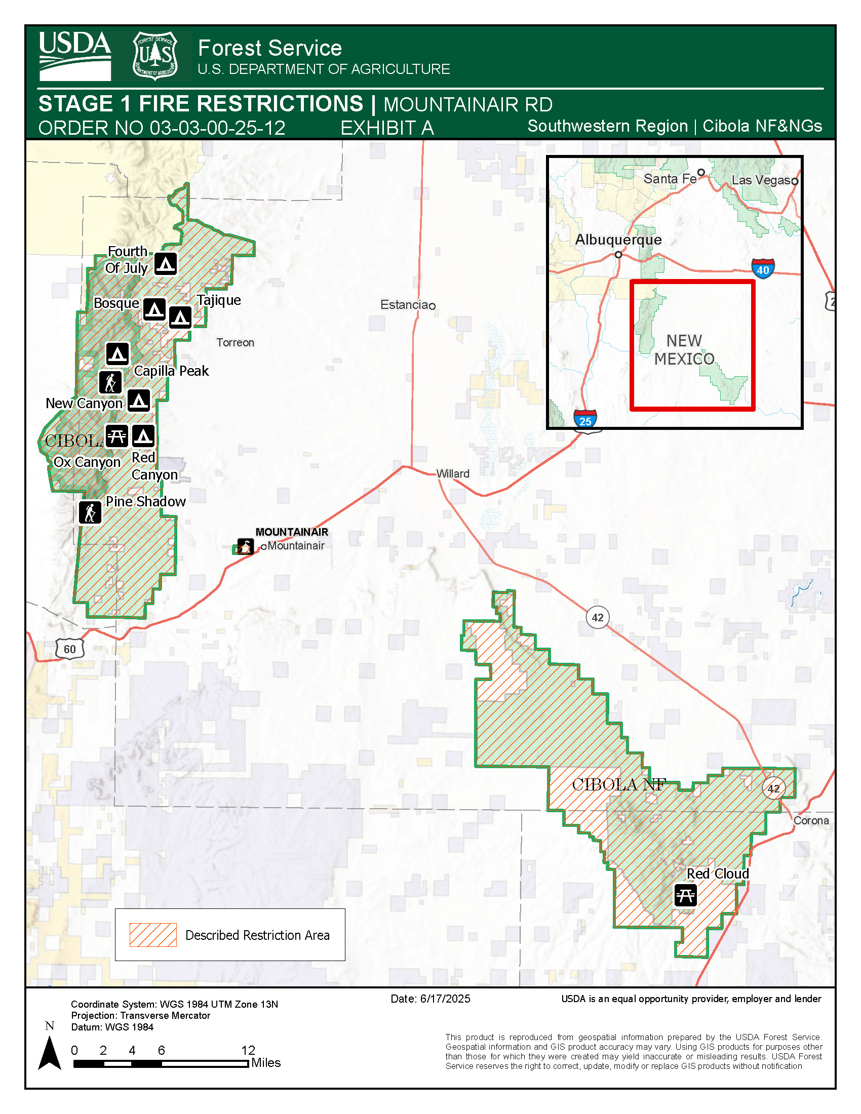 The official stage 1 fire restriction order for Mountainair and Sandia Ranger Districts (03-03-00-25-12) is posted on the Cibola National Forest and National Grasslands Alerts & Notices: https://www.fs.usda.gov/r03/cibola