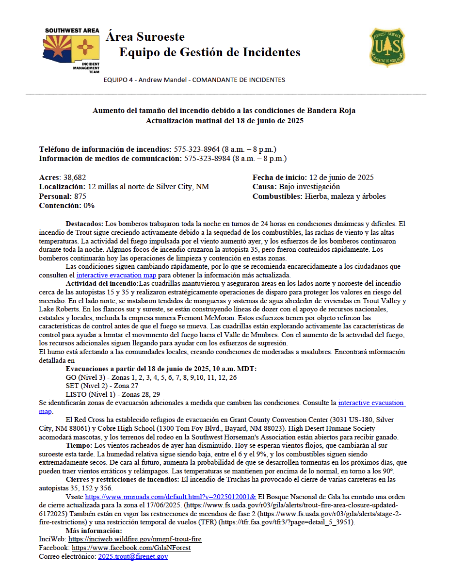 Closures & Fire Restrictions: The Trout Fire has caused several road closures on Highways 35, 152, and 356. Visit https://www.nmroads.com/default.html?v=2025012001, and the Gila National Forest has issued an updated closure order for the area on 6/17/2025. (https://www.fs.usda.gov/r03/gila/alerts/trout-fire-area-closure-updated-6172025) Stage 2 Fire Restrictions are also in place (https://www.fs.usda.gov/r03/gila/alerts/stage-2-fire-restrictions), and a Temporary Flight Restriction (TFR) is in effect (https://tfr.faa.gov/tfr3/?page=detail_5_3951).
