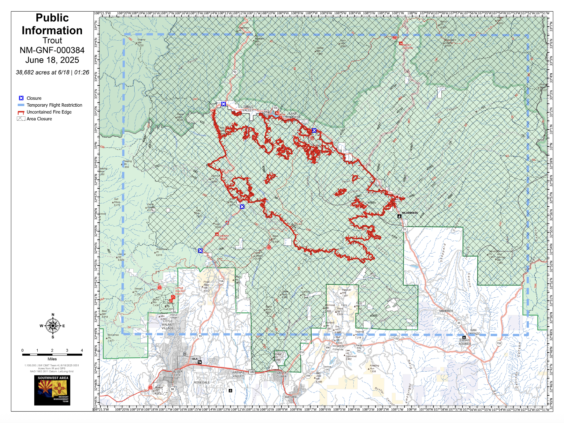 Closures & Fire Restrictions: The Trout Fire has caused several road closures on Highways 35, 152, and 356. Visit https://www.nmroads.com/default.html?v=2025012001& The Gila National Forest has issued an updated closure order for the area on 6/17/2025. (https://www.fs.usda.gov/r03/gila/alerts/trout-fire-area-closure-updated-6172025) Stage 2 Fire Restrictions are also in place (https://www.fs.usda.gov/r03/gila/alerts/stage-2-fire-restrictions), and a Temporary Flight Restriction (TFR) is in effect (https://tfr.faa.gov/tfr3/?page=detail_5_3951).