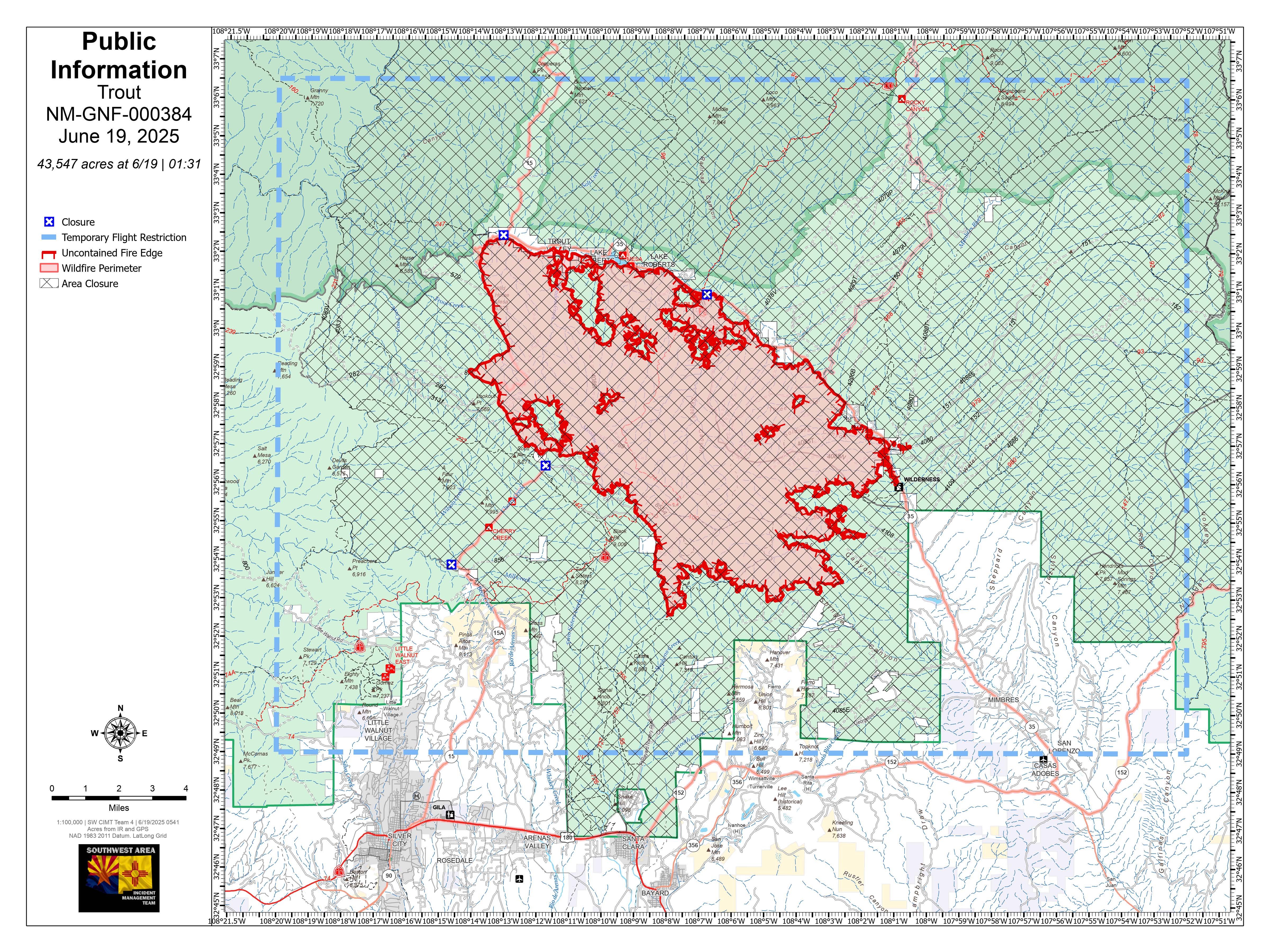 Closures & Fire Restrictions: The Trout Fire has caused several road closures on Highways 35, 152, and 356. Visit https://www.nmroads.com/default.html?v=2025012001, and the Gila National Forest has issued an updated closure order for the area on 6/17/2025. (https://www.fs.usda.gov/r03/gila/alerts/trout-fire-area-closure-updated- 6172025) Stage 2 Fire Restrictions are also in place (https://www.fs.usda.gov/r03/gila/alerts/stage-2-fire- restrictions), and a Temporary Flight Restriction (TFR) is in effect (https://tfr.faa.gov/tfr3/?page=detail_5_3951).