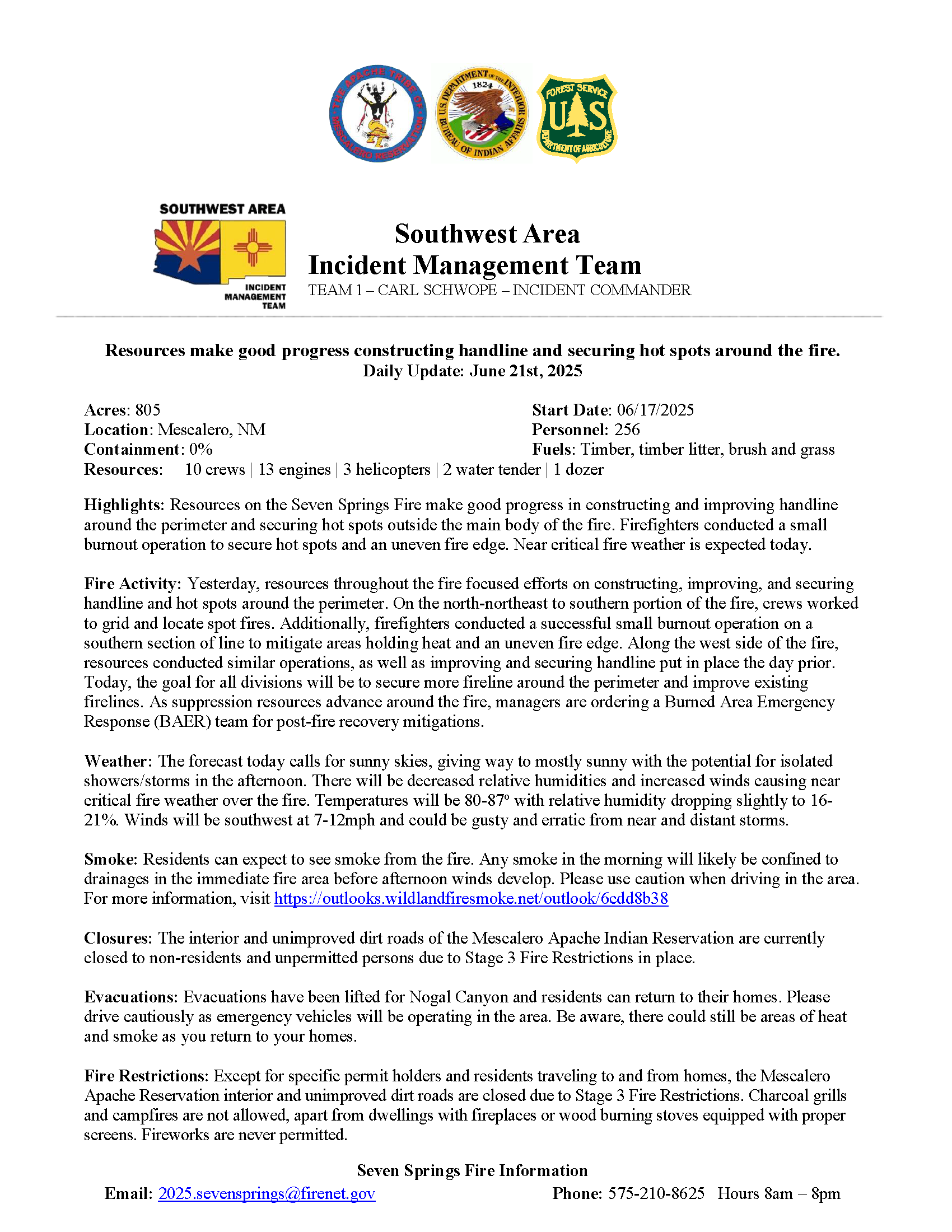 Highlights: Resources on the Seven Springs Fire make good progress in constructing and improving handline around the perimeter and securing hot spots outside the main body of the fire. Firefighters conducted a small burnout operation to secure hot spots and an uneven fire edge. Near critical fire weather is expected today.