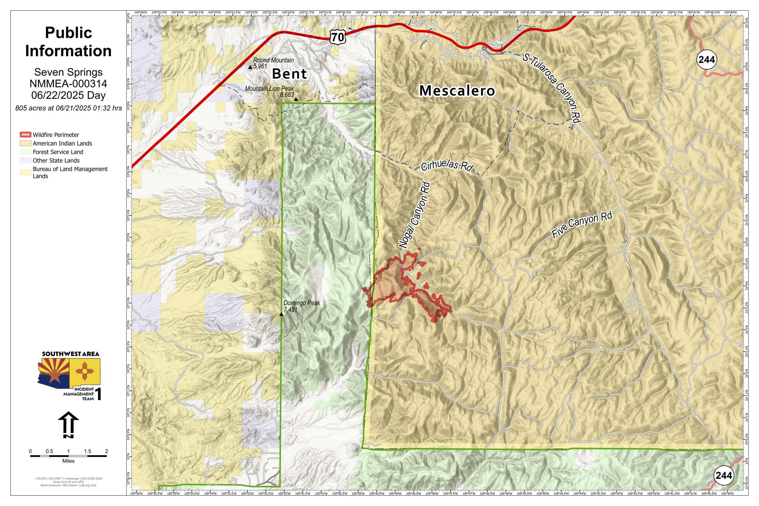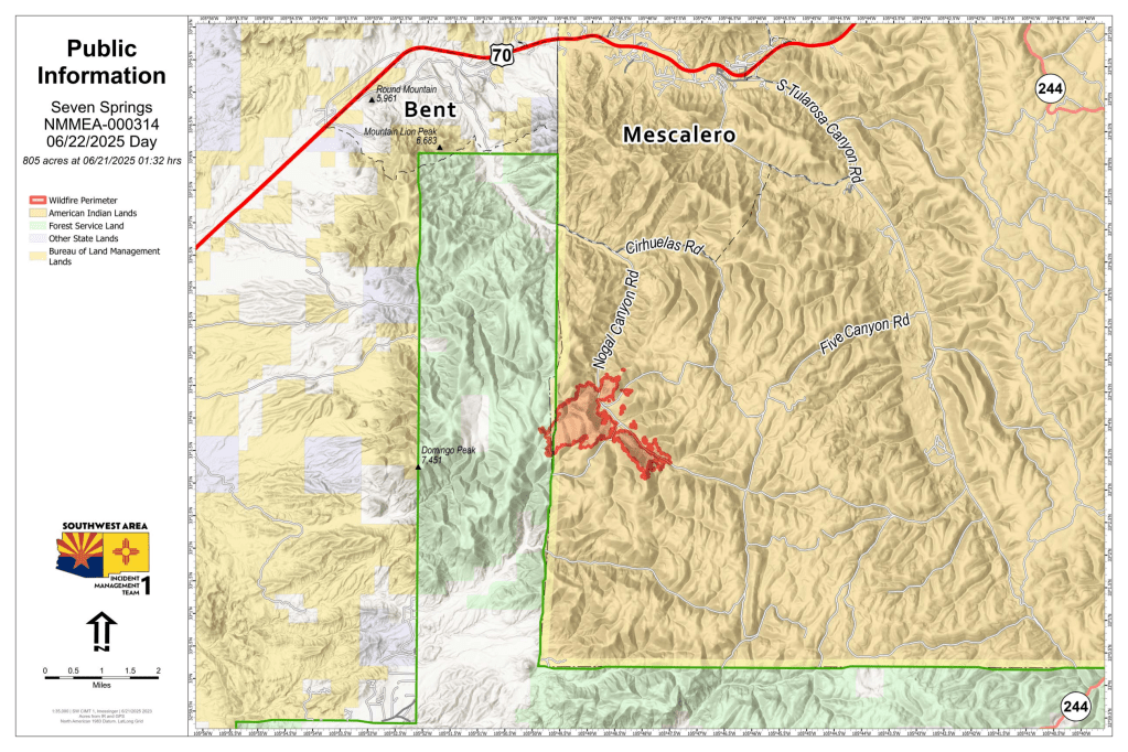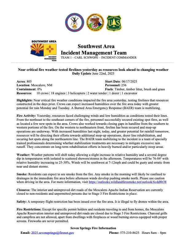 Closures: The interior and unimproved dirt roads of the Mescalero Apache Indian Reservation are currently closed to non-residents and unpermitted persons due to Stage 3 Fire Restrictions in place.