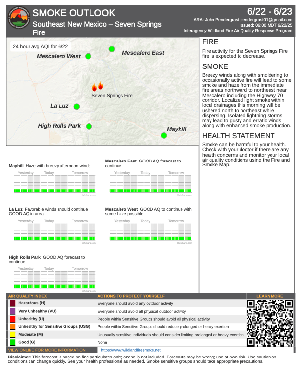 Smoke: Residents can expect to see smoke from the fire. Any smoke in the morning will likely be confined to drainages in the immediate fire area before afternoon winds develop pushing smoke north. Please use caution when driving in the area. For more information, visit https://outlooks.wildlandfiresmoke.net/outlook/6cdd8b38