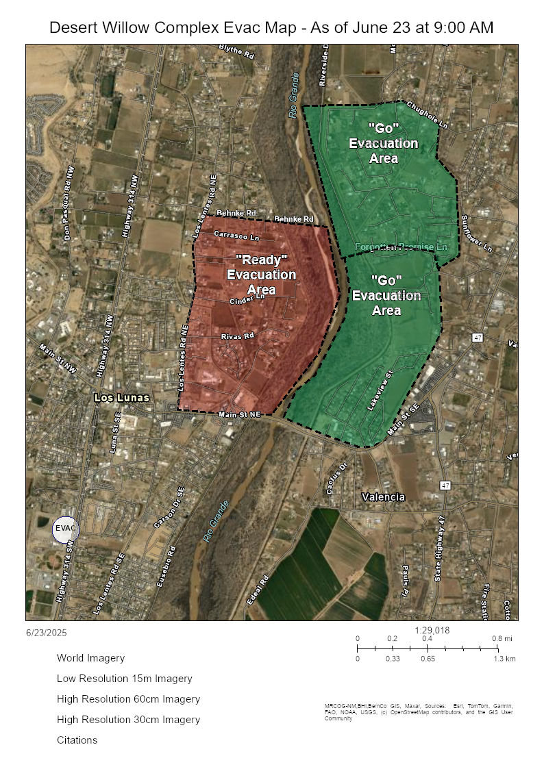 Shelters: Daniel Fernandez Recreation Center, 1103 NM-314, Los Lunas, NM 87031, where American Red Cross has relief efforts for displaced residents. Large animals can go to the Sheriff’s Posse at the I-25 Bypass in the City of Belen.