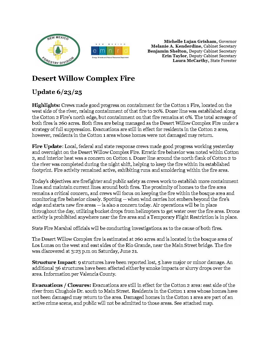 Highlights: Crews made good progress on containment for the Cotton 1 Fire, located on the west side of the river, raising containment of that fire to 20%. Dozer line was established along the Cotton 2 Fire’s north edge, but containment on that fire remains at 0%. The total acreage of both fires is 260 acres. Both fires are being managed as the Desert Willow Complex Fire under a strategy of full suppression. Evacuations are still in effect for residents in the Cotton 2 area, however, residents in the Cotton 1 area whose homes were not damaged may return.