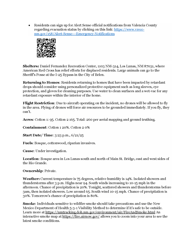 - Residents can sign up for Alert Sense official notifications from Valencia County regarding evacuation status by clicking on this link: https://www.vrecc-nm.gov/158/Alert-Sense—Emergency-Notifications