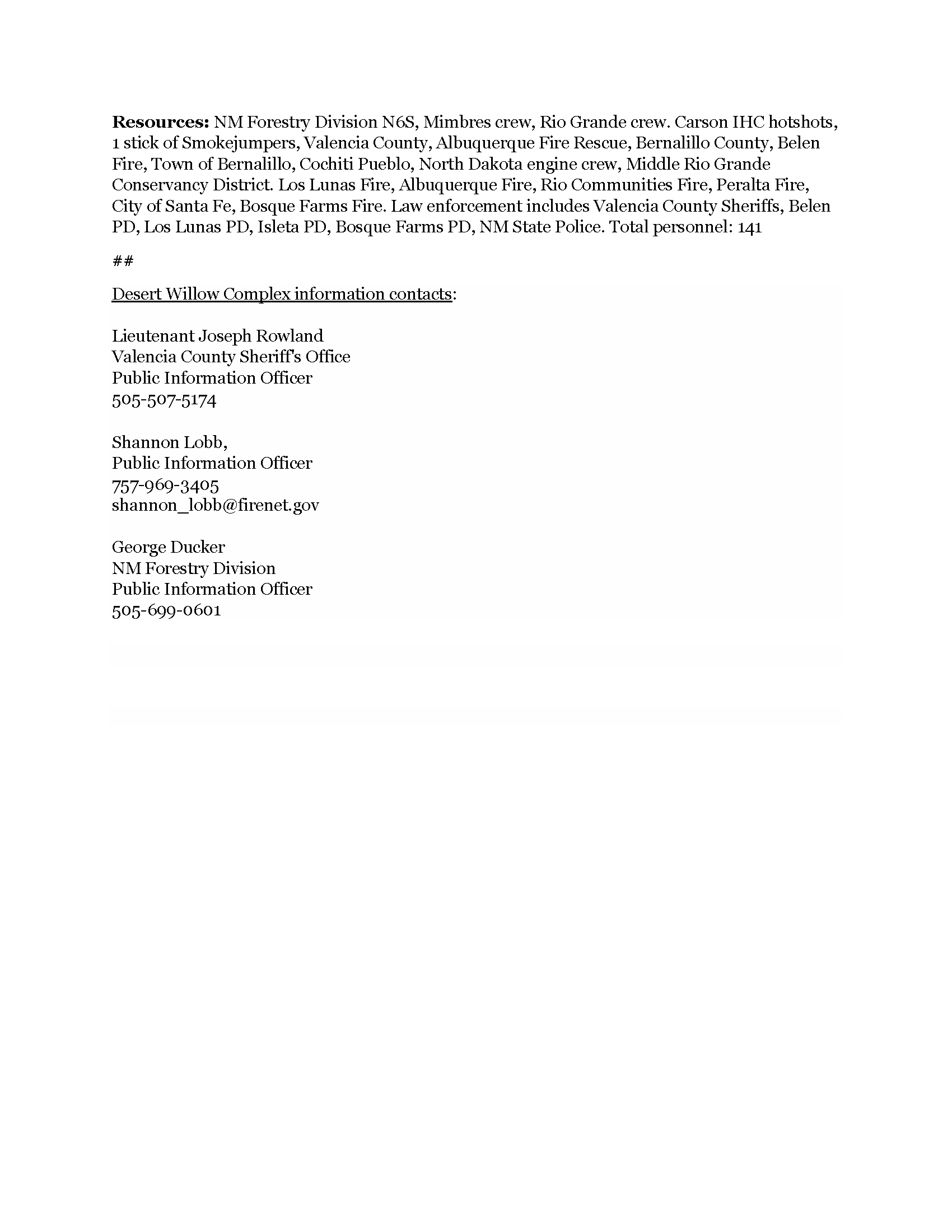 Resources: NM Forestry Division N6S, Mimbres crew, Rio Grande crew. Carson IHC hotshots, 1 stick of Smokejumpers, Valencia County, Albuquerque Fire Rescue, Bernalillo County, Belen Fire, Town of Bernalillo, Cochiti Pueblo, North Dakota engine crew, Middle Rio Grande Conservancy District. Los Lunas Fire, Albuquerque Fire, Rio Communities Fire, Peralta Fire, City of Santa Fe, Bosque Farms Fire. Law enforcement includes Valencia County Sheriffs, Belen PD, Los Lunas PD, Isleta PD, Bosque Farms PD, NM State Police. Total personnel: 141
