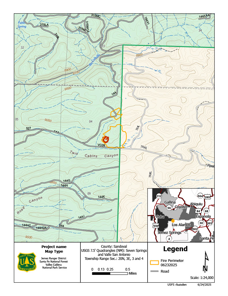 Santa Fe National Forest (SFNF) fire managers were notified of a new wildfire start, named the Twin Cabins wildfire, on the afternoon of Monday June 23, 2025. The wildfire is in the Jemez Ranger District, near the northwest boundary between the Valles Caldera National Preserve and the Santa Fe National Forest, adjacent to Forest Road 144 and Twin Cabins Canyon.