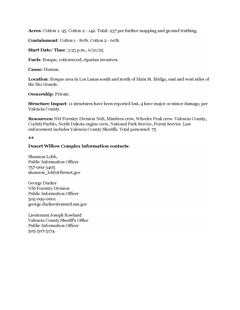 Community Information: Daniel Fernandez Center will close their resource center at the end of the day. The Village of Los Lunas is accepted monetary donations through a partnership with United Way: https://give.uwncnm.org/campaign/699958/donate. Community information on the fire and services is available on the Village of Los Lunas website: https://www.loslunasnm.gov/1347/Desert-Willow-Complex-Fire-Information