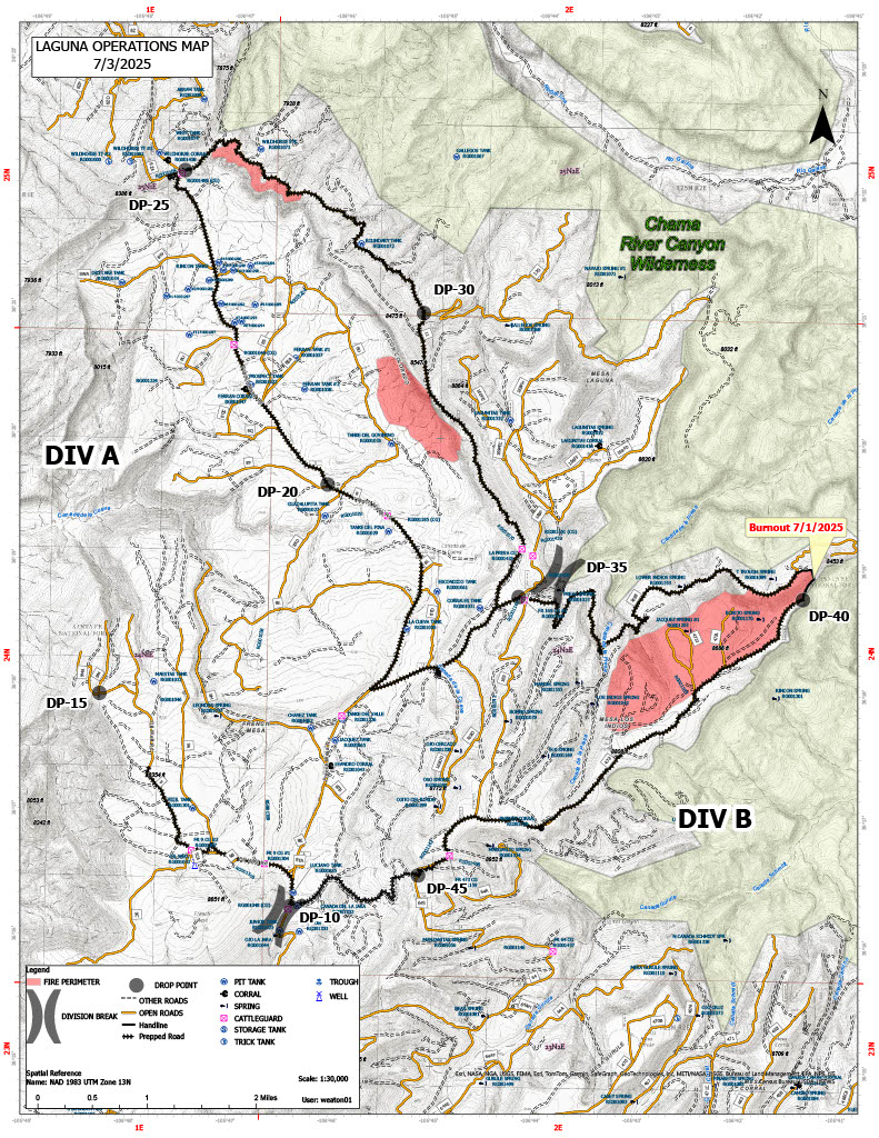 Smoke: Light winds today will push any smoke produced east and southeast of the fire this afternoon. Overnight smoke is expected to settle in the Rio Chama River valley, with the potential for some smoke settling along the NM State Road 96 corridor between La Jara and Coyote overnight, but no significant impacts are expected.