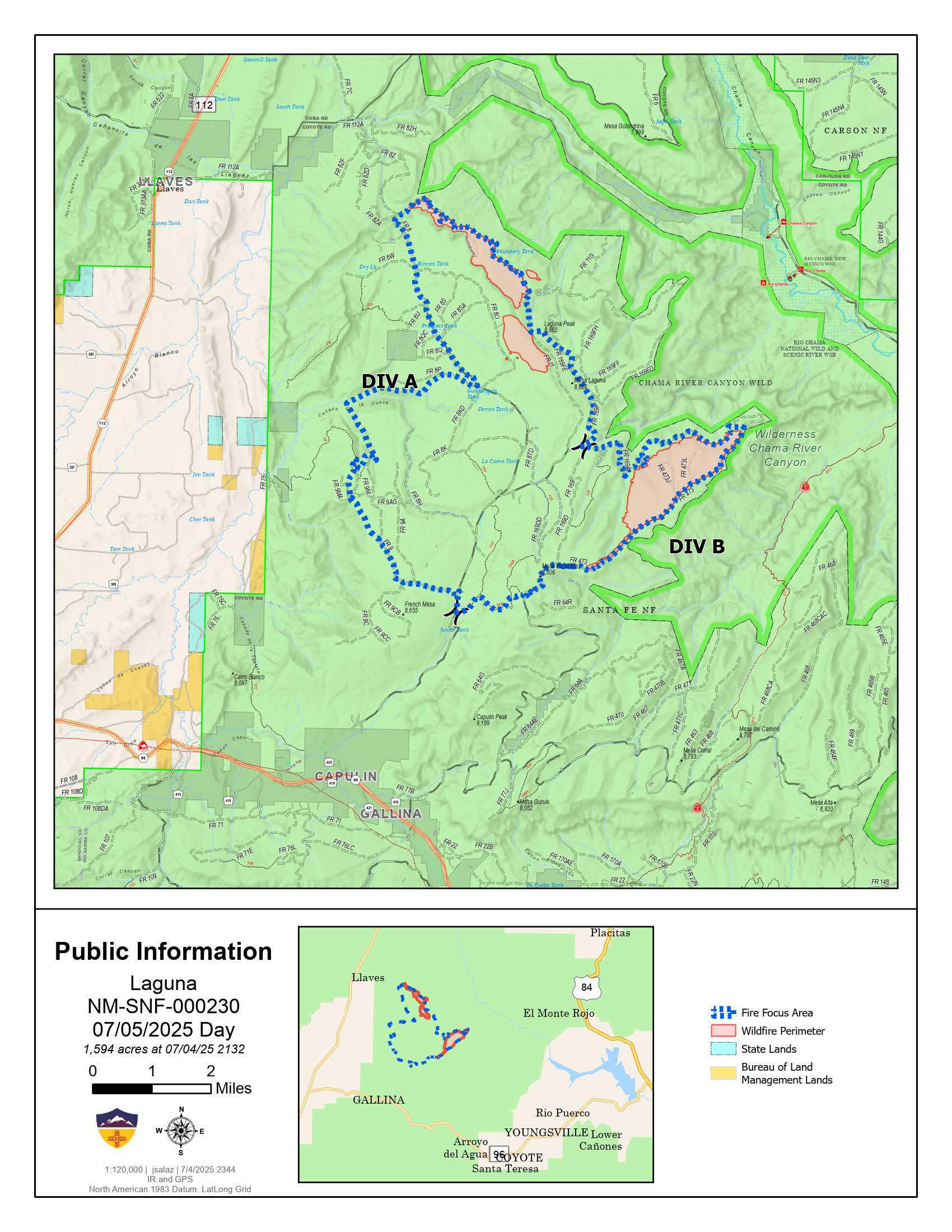 The Laguna Wildfire, burning north of Gallinas NM, has burned approximately 1600 acres within the planned fire area. Smoke is expected to continue to impact areas east and southeast of the fire, including Santa Fe.