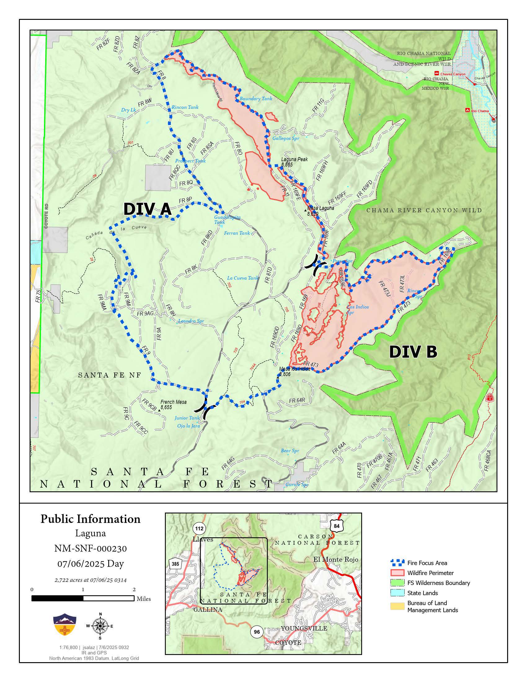 Actualmente, estudios cartográficos realizados durante la noche del 5 al 6 de julio muestran que el incendio forestal de Laguna ha alcanzado una extensión de 2.700 acres y ha sido completado en un 15%. Se espera que la actividad del fuego se incremente hoy y el humo continuara afectando el Valle del Río Chama y las comunidades al este del incendio.