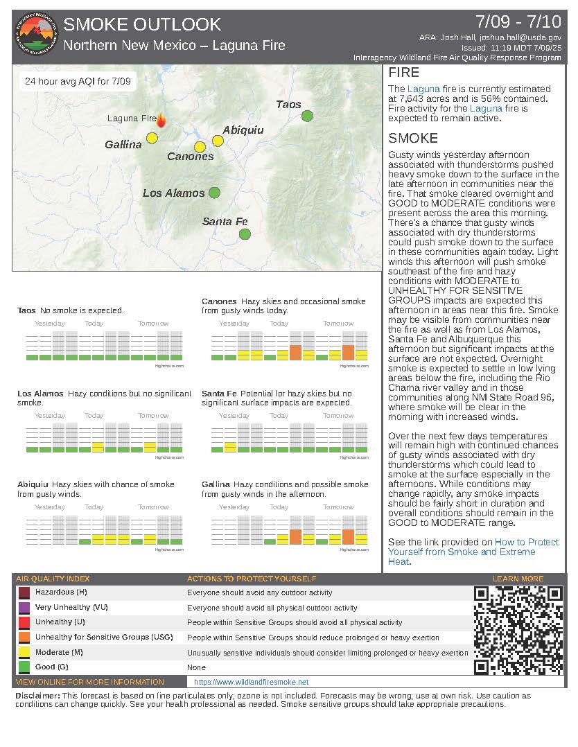 Gusty winds yesterday afternoon associated with thunderstorms pushed heavy smoke down to the surface in the late afternoon in communities near the fire. That smoke cleared overnight and GOOD to MODERATE conditions were present across the area this morning. There’s a chance that gusty winds associated with dry thunderstorms could push smoke down to the surface in these communities again today. Light winds this afternoon will push smoke southeast of the fire and hazy conditions with MODERATE to UNHEALTHY FOR SENSITIVE GROUPS impacts are expected this afternoon in areas near this fire. Smoke may be visible from communities near the fire as well as from Los Alamos, Santa Fe and Albuquerque this afternoon but significant impacts at the surface are not expected. Overnight smoke is expected to settle in low lying areas below the fire, including the Rio Chama river valley and in those communities along NM State Road 96, where smoke will be clear in the morning with increased winds.