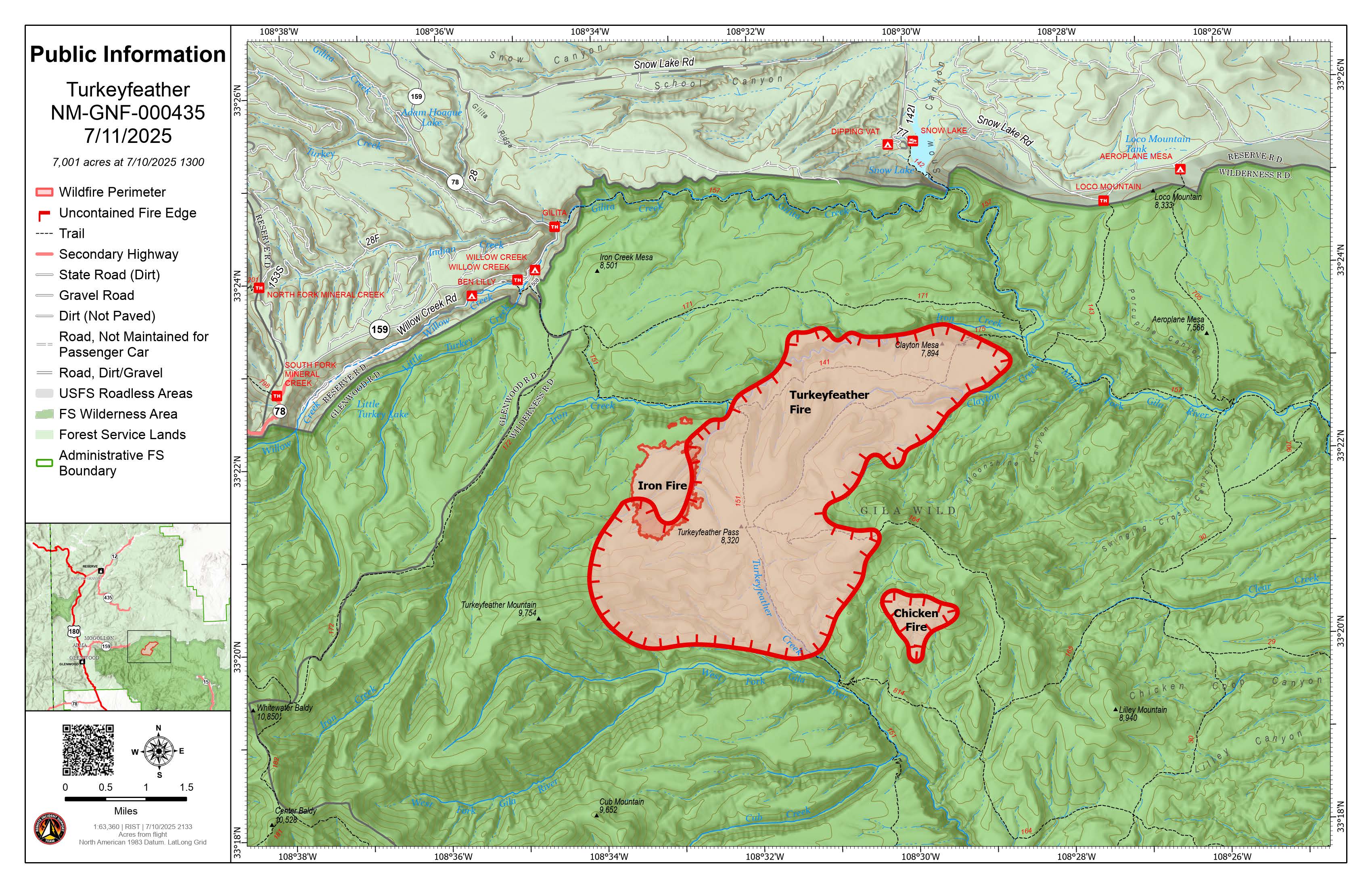 Summary: The Turkeyfeather Fire is active in the northern Gila Wilderness. It is located west of the Middle Fork of the Gila River, south of Iron Creek and east of Cooper Canyon. A second fire in the area, the Chicken Fire, is also active. Although there is a possibility the two fires could merge, they have not done so. Visitors to the Gila Wilderness should be aware that the fires are burning in the area of Lilley Park Trail #164, Iron Creek Mesa Trail #171, and Cooper Trail #141 and Turkeyfeather Pass.