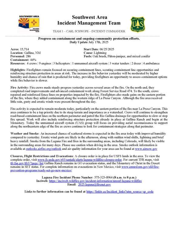 Closures, Flight Restrictions and Evacuations: A closure order is in place for USFS lands in the area. To view the complete order, visit www.fs.usda.gov/r03/santafe/alerts/laguna-wildfire-closure-order. For current TFR maps, visit tfr.faa.gov/tfr3/?page=list Gallina Ranch remains in GO evacuation status, and the Monastery of Christ in the Desert remains in SET status. For complete information on evacuations in New Mexico, visit www.emnrd.nm.gov/sfd/fire-prevention-programs/ready-set-go-new-mexico/