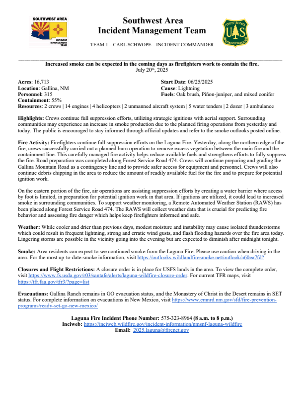 Laguna Fire Incident Phone Number: 575-323-8964 (8 a.m. to 8 p.m.)