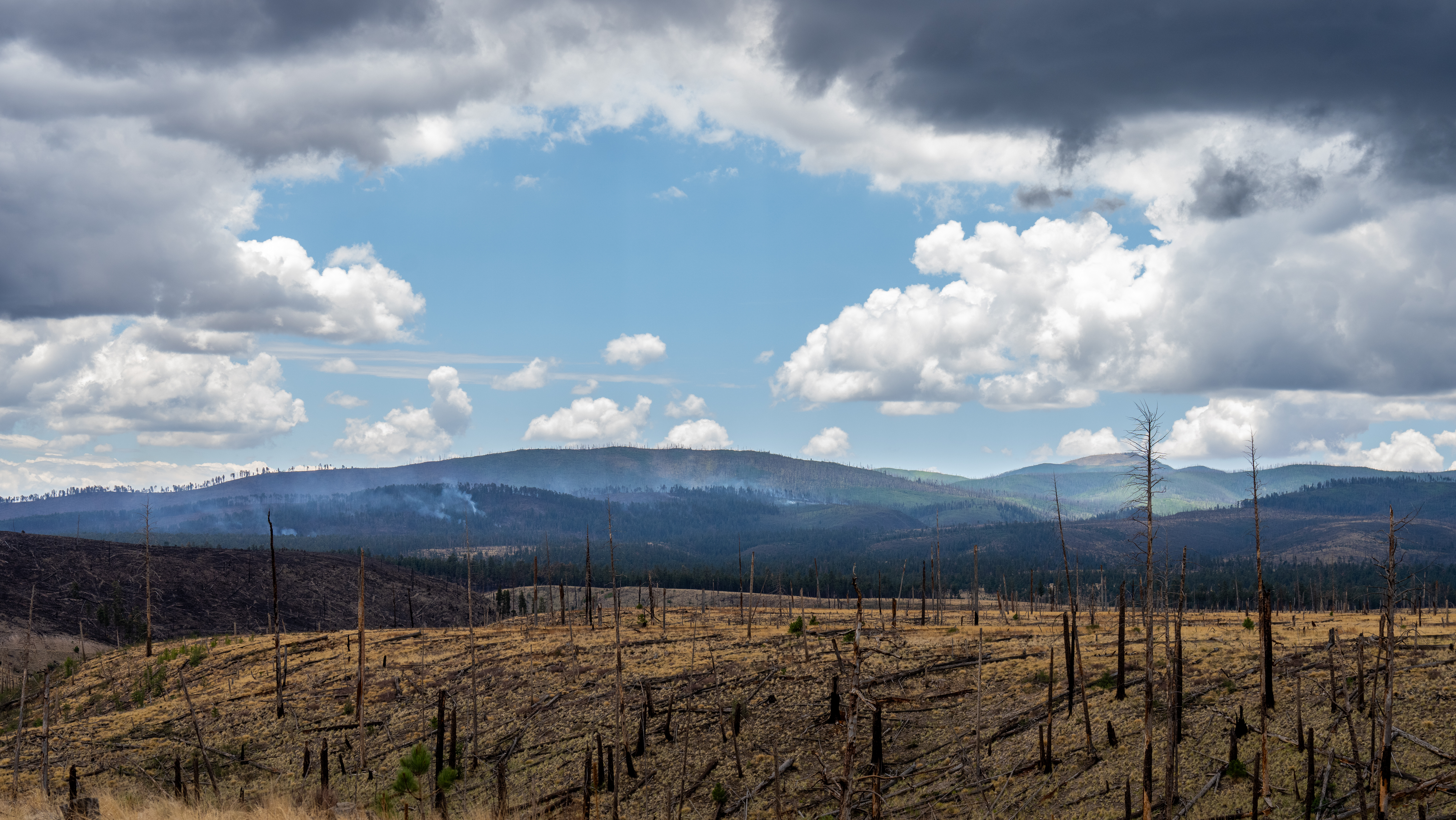 Saturday afternoon the Turkeyfeather wildfire received widespread, wetting rains. The increased moisture and overcast skies helped minimize fire behavior, with the fire primarily creeping and smoldering in the area southeast of Willow Creek and around Moonshine Canyon.