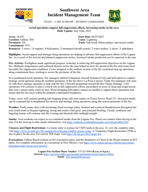 Laguna Fire Incident Phone Number: 575-323-8964 (8 a.m. to 8 p.m.)