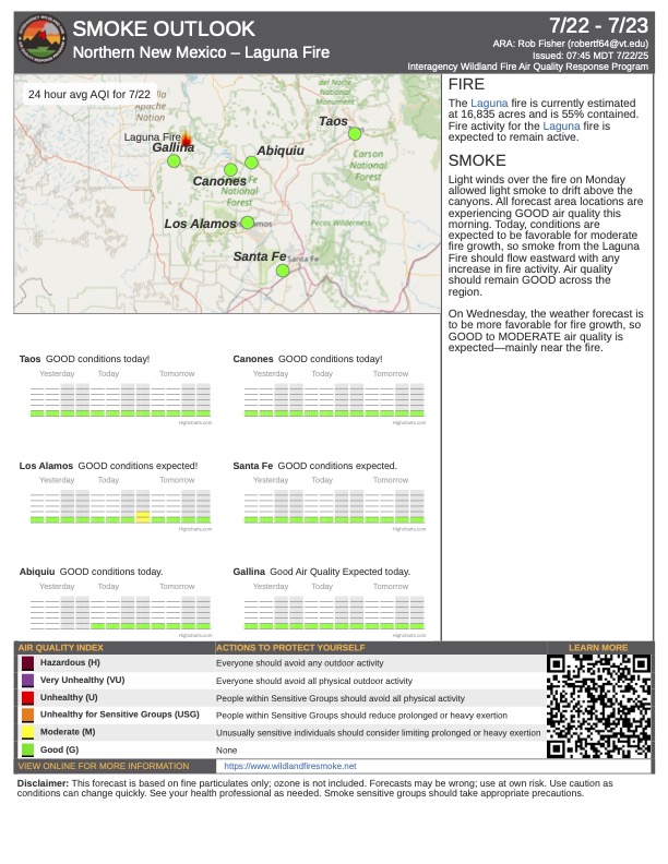 Smoke: Area residents can expect to see continued smoke from the Laguna Fire. Please use caution when driving in the area. For the most up-to-date smoke information, visit https://outlooks.wildlandfiresmoke.net/outlook/a60ea7fd?