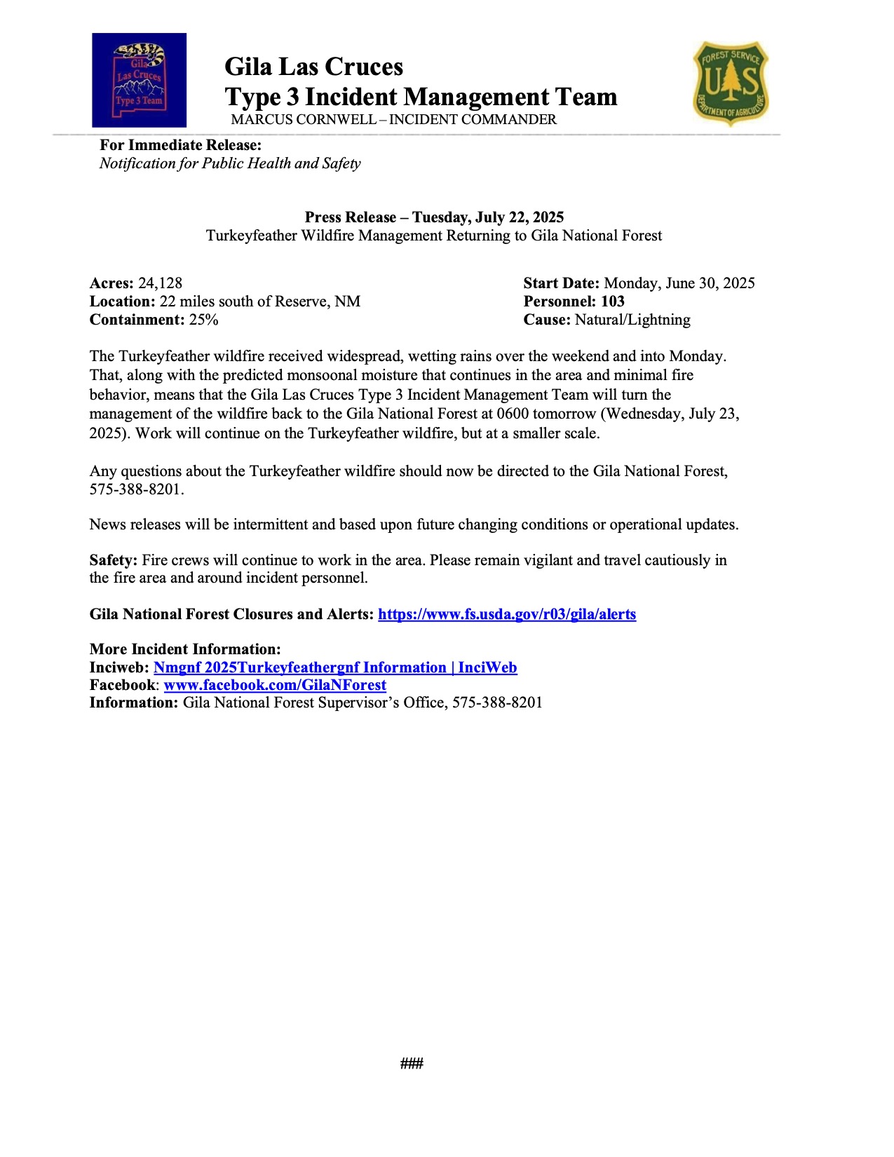The Turkeyfeather wildfire received widespread, wetting rains over the weekend and into Monday. That, along with the predicted monsoonal moisture that continues in the area and minimal fire behavior, means that the Gila Las Cruces Type 3 Incident Management Team will turn the management of the wildfire back to the Gila National Forest at 0600 tomorrow (Wednesday, July 23, 2025). Work will continue on the Turkeyfeather wildfire, but at a smaller scale.