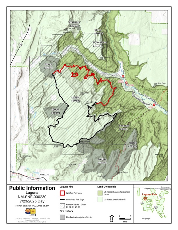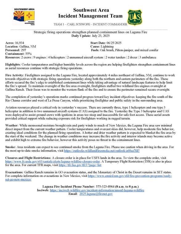 Fire Activity: Firefighters assigned to the Laguna Fire, located approximately 4 miles northeast of Gallina, NM, continue to work towards objectives with strategic firing operations yesterday along both the northern and eastern perimeters of the fire. These efforts secured the fire’s edge to established containment lines while taking advantage of natural landscape features to help limit the fire’s spread. To maintain oversight of the fire area overnight, firefighters staffed two wildland fire engines overnight at Gallina Ranch. Their focus was to monitor the western flank of the fire and to ensure the perimeter remained secure overnight.