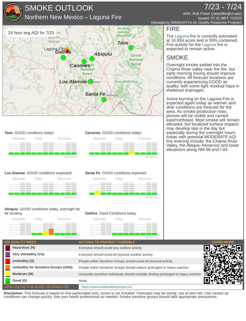 Smoke: Area residents can expect to see continued smoke from the Laguna Fire. Please use caution when driving in the area. For the most up-to-date smoke information, visit https://outlooks.wildlandfiresmoke.net/outlook/a60ea7fd?