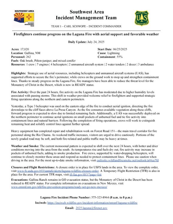 Evacuations: Gallina Ranch remains in GO evacuation status, but the Monastery of Christ in the Desert has been reduced to READY status. For complete information on evacuations in New Mexico, visit http://www.emnrd.nm.gov/sfd/fire-prevention-programs/ready-set-go-new-mexico/