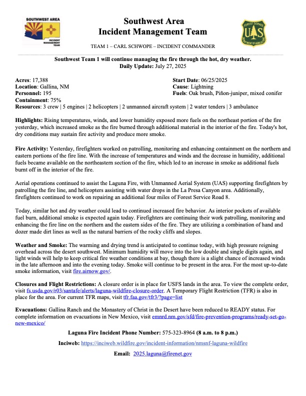 Laguna Fire Incident Phone Number: 575-323-8964 (8 a.m. to 8 p.m.)