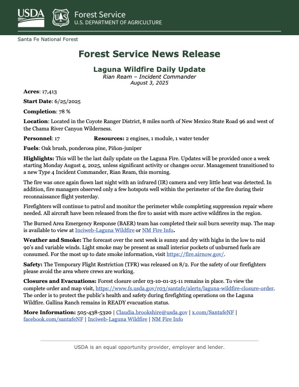 More Information: 505-438-5320 | Claudia.brookshire@usda.gov | x.com/SantafeNF | facebook.com/santafeNF | Inciweb-Laguna Wildfire | NM Fire Info