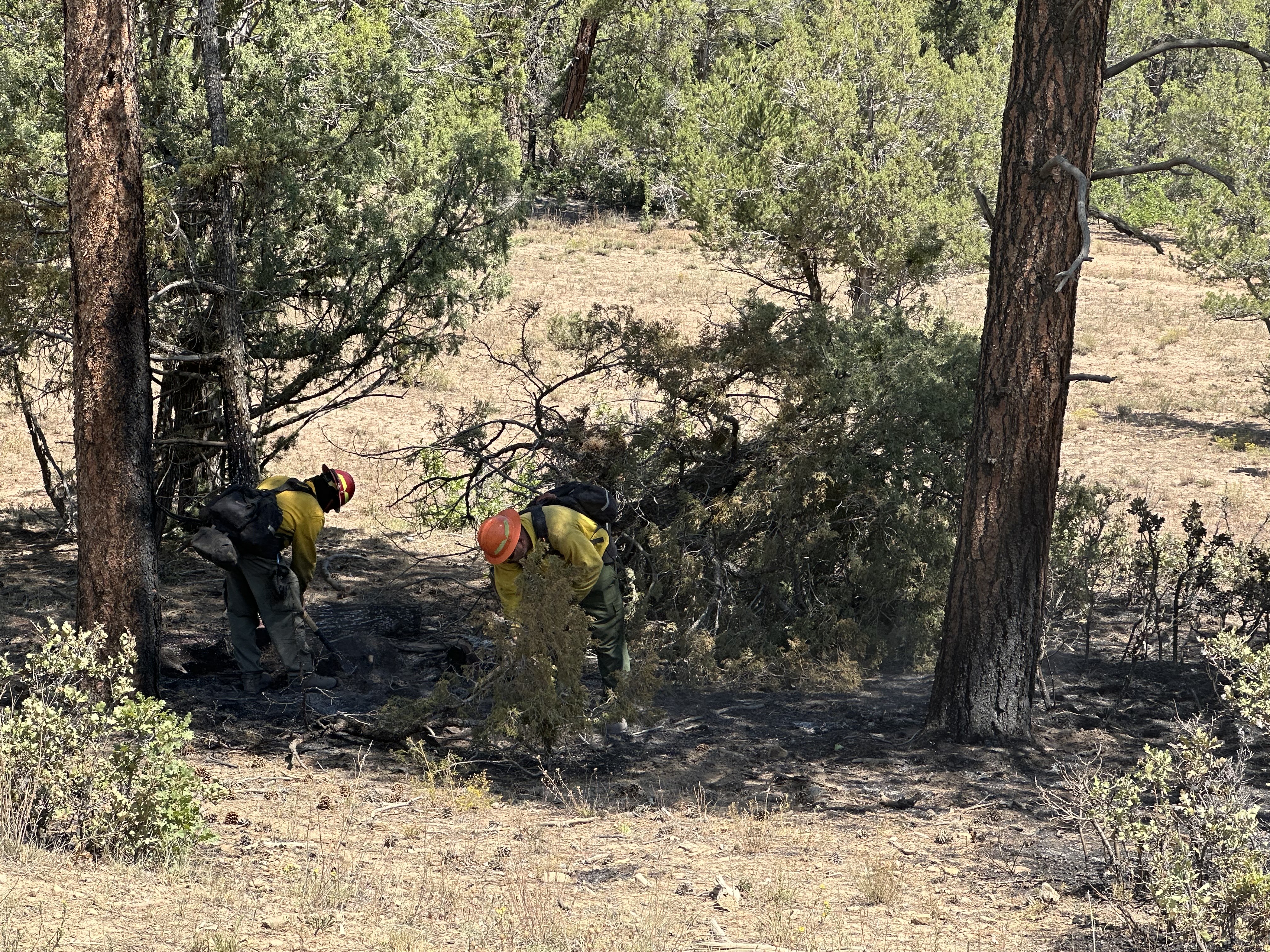 Operations: Yesterday, containment was added along Forest Road 218A on the north side of the fire. Crews continued mopping up the northeast and southeast sides of the fire. Stagnant hot and dry conditions fueled activity and caused interior pockets of green trees and brush to burn, producing light smoke throughout the day Saturday. Near Alamo Canyon, firefighters continued patrolling and extinguishing heat, taking advantage of lower winds. Patrols also continued on the western perimeter of the fire, where fire activity is minimal. Today, firefighters will continue working in all areas of the fire to extinguish heat near the firelines. Engines and water tenders are supporting crews by delivering water to aid in the mop up operations. Fire managers are being thorough in this effort as any wind can create flareups and a single ember blown outside of the lines could cause challenges. They are also working side-by-side with Resource Advisors to avoid disturbing cultural sites. Additional resources from the Middle Mesa Fire are ready to respond to any new fire starts in the area.