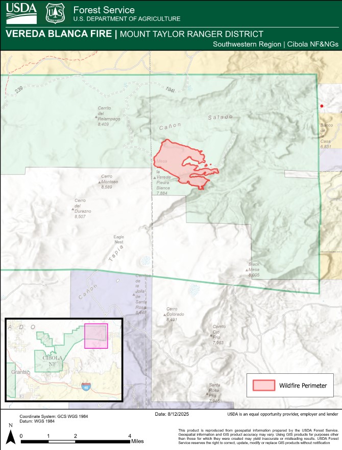 Weather forecast for Grants, NM: Tuesday (8/12/25) A 30 percent chance of showers and thunderstorms, mainly after 3pm. Mostly sunny, with a high near 88. Light south wind becoming southeast 5 to 10 mph in the morning. Wednesday (8/13/25) A 20 percent chance of showers and thunderstorms after 3pm. Mostly sunny, with a high near 92. https://www.weather.gov/ All fire information and updates will be posted on the inciweb.wildfire.gov, Cibola NF & NGs website, New Mexico Fire Information website, and the Cibola NF & NGs Facebook & X pages.