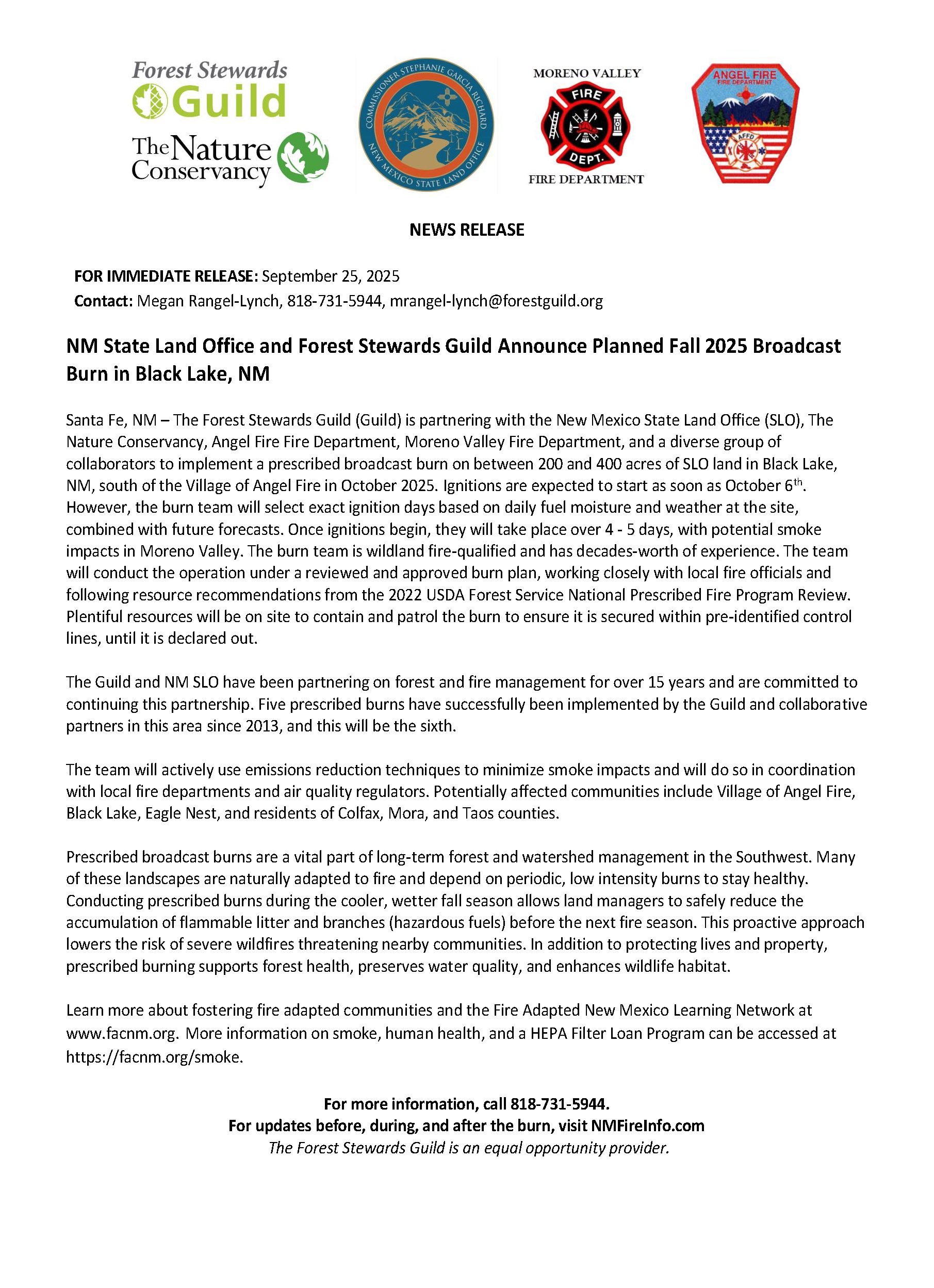 Santa Fe, NM – The Forest Stewards Guild (Guild) is partnering with the New Mexico State Land Office (SLO), The Nature Conservancy, Angel Fire Fire Department, Moreno Valley Fire Department, and a diverse group of collaborators to implement a prescribed broadcast burn on between 200 and 400 acres of SLO land in Black Lake, NM, south of the Village of Angel Fire in October 2025. Ignitions are expected to start as soon as October 6th. However, the burn team will select exact ignition days based on daily fuel moisture and weather at the site, combined with future forecasts. Once ignitions begin, they will take place over 4 – 5 days, with potential smoke impacts in Moreno Valley. The burn team is wildland fire-qualified and has decades-worth of experience. The team will conduct the operation under a reviewed and approved burn plan, working closely with local fire officials and following resource recommendations from the 2022 USDA Forest Service National Prescribed Fire Program Review. Plentiful resources will be on site to contain and patrol the burn to ensure it is secured within pre-identified control lines, until it is declared out.