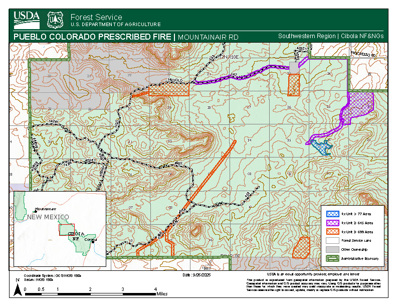 ALBUQUERQUE, NM – October 10, 2025 – The Cibola National Forest & National Grasslands (NF & NGs) is planning prescribed fire pile burn operations Wednesday October 15th pending all required approvals. This work will continue as a multi-day operation as weather conditions allow. We use prescribed fires to help reduce overgrown vegetation to help protect local communities, infrastructure and natural resources from wildfires.