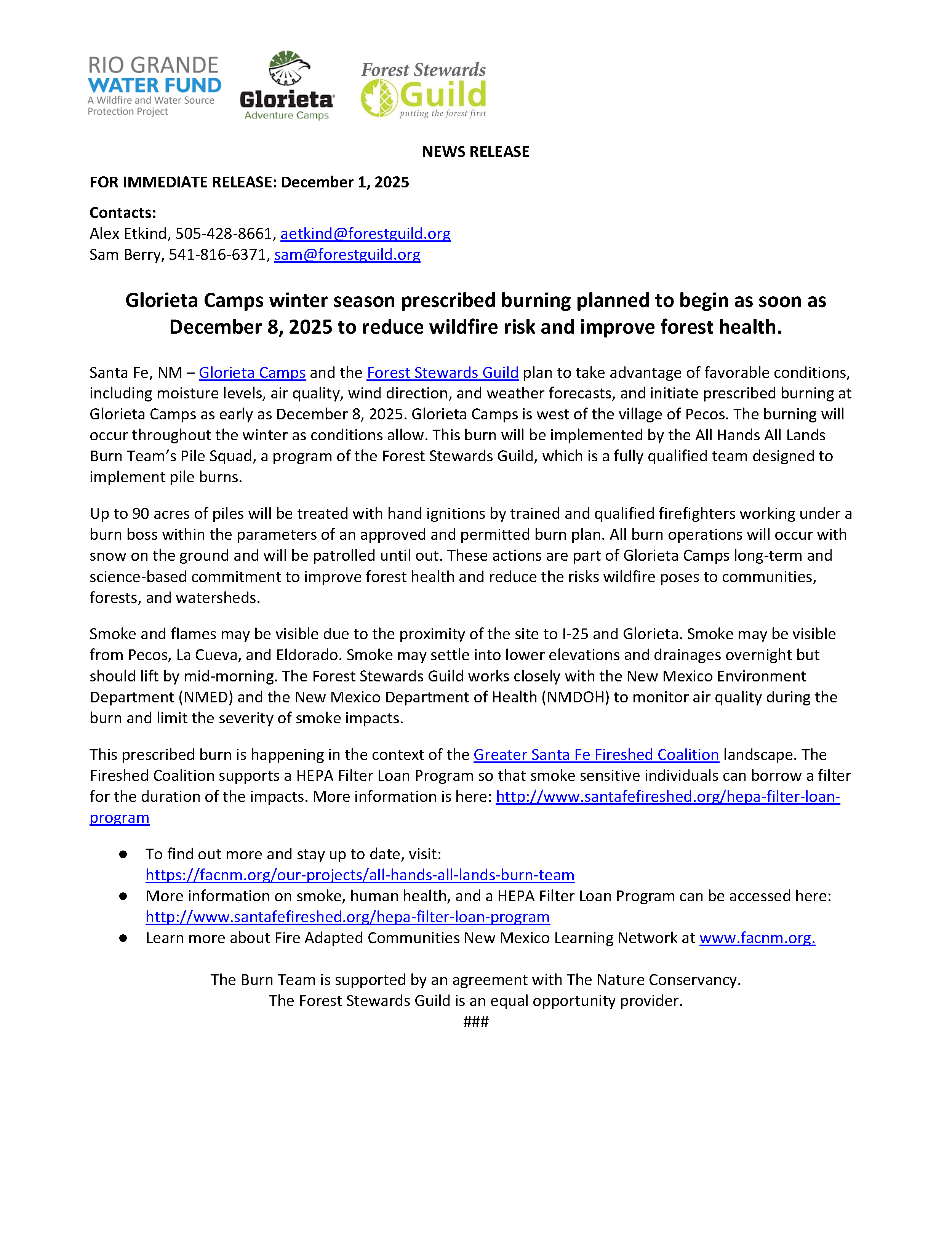 Santa Fe, NM – Glorieta Camps and the Forest Stewards Guild plan to take advantage of favorable conditions, including moisture levels, air quality, wind direction, and weather forecasts, and initiate prescribed burning at Glorieta Camps as early as December 8, 2025. Glorieta Camps is west of the village of Pecos. The burning will occur throughout the winter as conditions allow. This burn will be implemented by the All Hands All Lands Burn Team’s Pile Squad, a program of the Forest Stewards Guild, which is a fully qualified team designed to implement pile burns.
