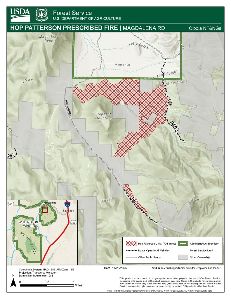 ALBUQUERQUE, NM – January 27, 2026 – As previously announced, the Cibola National Forest & National Grasslands (NF & NGs) implemented prescribed fire operations yesterday on the Magdalena Ranger District Hop Patterson Prescribed (Rx) Fire & Mountainair Ranger District Pueblo Colorado Prescribed (Rx) Fire Piles.