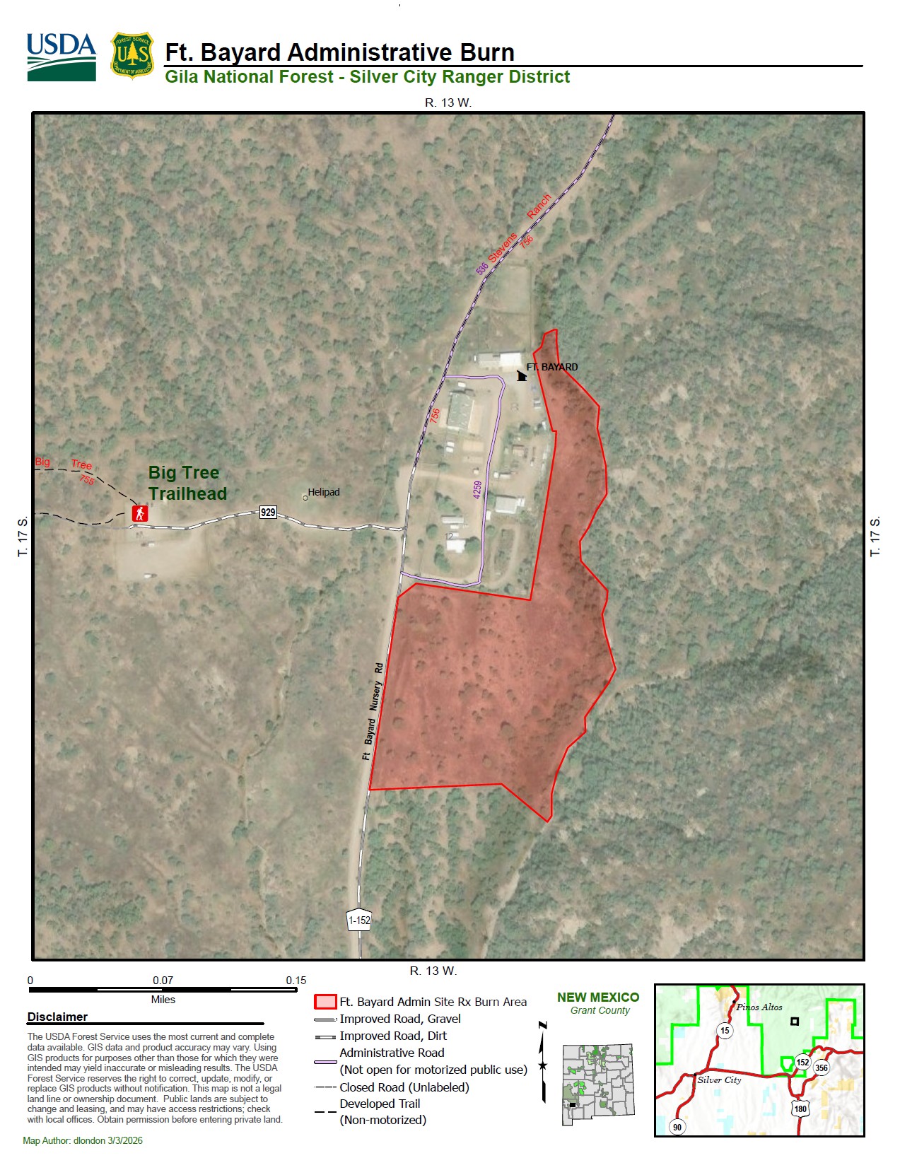 - Approximately five acres of hazardous fuels adjacent to the Ft. Bayard Administrative Site (closed to the public) near the Big Tree Trailhead, 4.5 miles north of US 180. Map attached.