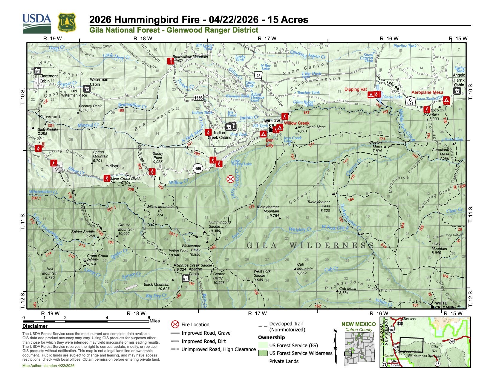 Widespread thunderstorms moved through the area Monday afternoon, igniting several fires across the Gila National Forest. Around 4:45 p.m., the Black Mountain lookout detected a small amount of smoke south of the community of Willow Creek in the Gila Wilderness on the Glenwood Ranger District. An engine crew was dispatched immediately but unable to locate the fire Monday evening. When they found the fire Tuesday morning, it was 0.25 acres and exhibiting moderate fire behavior. The Gila Interagency Hotshot Crew was mobilized Tuesday to assist the engine crew, and a large airtanker dropped retardant around the fire to slow the fire’s spread and protect the community of Willow Creek.
