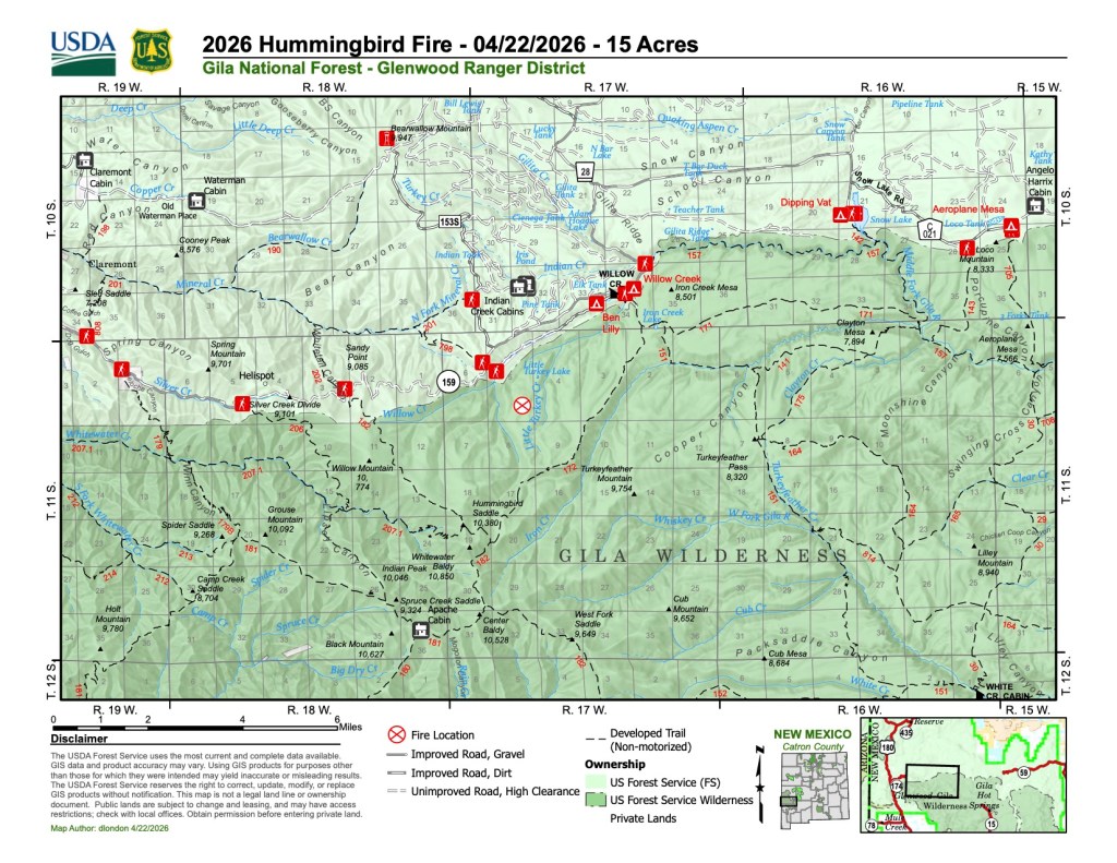 The fire is burning within the 2012 Whitewater-Baldy Fire burn scar, where brush and large dead trees—both standing and downed—are abundant. The retardant did not halt the fire’s spread, and crews reported that the fire continued to actively burn until 1 a.m. Wednesday. The fire is currently estimated to be 15 acres and is moving eastward and southward. As winds increase Wednesday afternoon, fire activity is expected to increase. Local resources assigned to the incident Wednesday include two engine crews, the Gila Hotshots, a Type 3 helicopter, and a Type 1 helicopter.