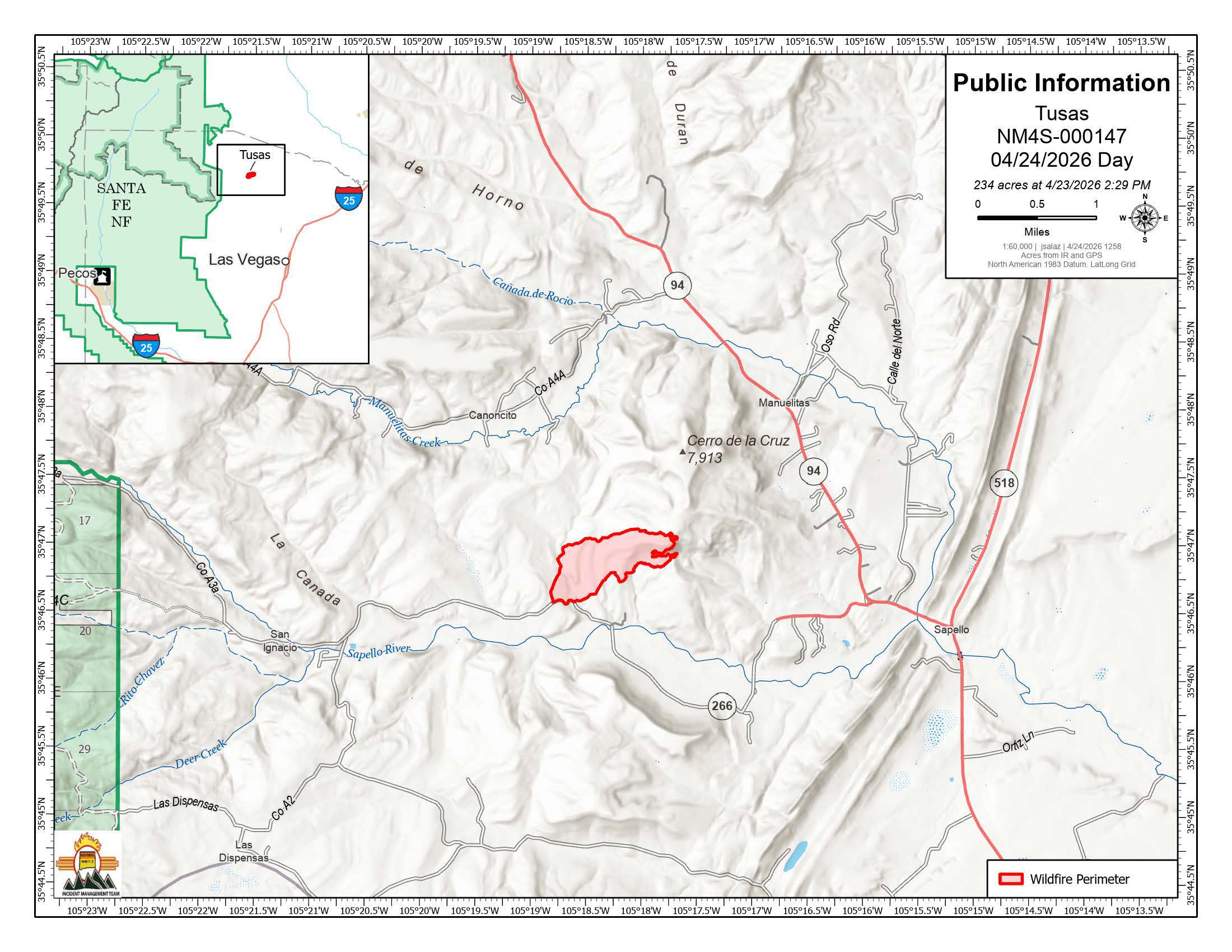 El Equipo de Gestión de Incidentes de Tipo 3 del Norte de Nuevo México, dirigido por el comandante de incidentes Steven Griego, asumió el mando del incendio el viernes, el 24 de abril, relevando al equipo de gestión de incidentes ad hoc de la División Forestal de Nuevo México. Los cierres de carreteras en la zona continúan vigentes; sin embargo, se permite el regreso a los residentes de la carretera NM 266. Todas las zonas de evacuación anteriores han sido reclasificadas al estado de «Preparados», incluyendo NM 266 desde la CR A3 hasta la HWY 94, así como la HWY 94 hasta la CR A4A.